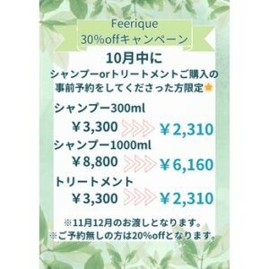 10月中にフェリークシャンプーorトリートメントのご予約をしてくださった方限定で30%off!!