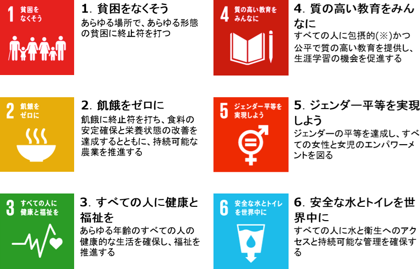 この6つの目標を見ていると、貧困や飢餓、健康や教育、さらには安全な水など開発途上国に対する支援に見えます。